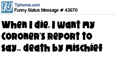X is When I die, I want my Coroner's report to say.. death by mischief