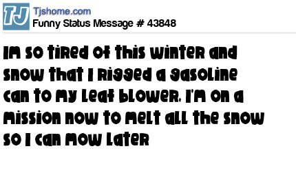 X is Im so tired of this winter and snow that I rigged a gasoline can to my leaf blower, I'm on a mission now to melt all the snow so I can mow later