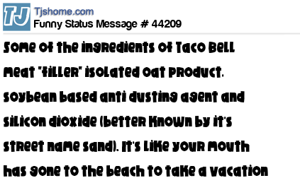X says Some of the ingredients of Taco Bell meat "filler" isolated oat product, soybean based anti dusting agent and silicon dioxide (better known by it's street name sand). It's like your mouth has gone to the beach to take a vacation from meat.
