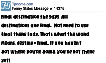 X Final destination she says. All destinations are final. Not need to use final there lady. Thats what the word means, destiny = final. If you haven't got where you're going, you're not there yet!