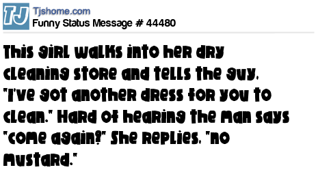 X is This girl walks into her dry cleaning store and tells the guy, "I've got another dress for you to clean." Hard of hearing the man says "come again?" She replies, "no mustard."