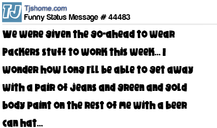 X says We were given the go-ahead to wear Packers stuff to work this week... I wonder how long I'll be able to get away with a pair of jeans and green and gold body paint on the rest of me with a beer can hat...