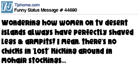 X is wondering how women on tv desert islands always have perfectly shaved legs & armpits? I mean, there's no chicks in 'Lost' kicking around in mohair stockings...