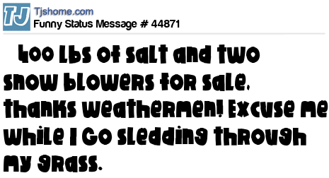 X says 400 lbs of salt and two snow blowers for sale, thanks weathermen! Excuse me while I Go sledding through my grass.