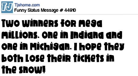 X is Two winners for mega millions. One in Indiana and one in Michigan. I hope they both lose their tickets in the snow!