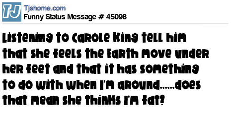 X is listening to Carole King tell him that she feels the Earth move under her feet and that it has something to do with when I'm around......does that mean she thinks I'm fat?