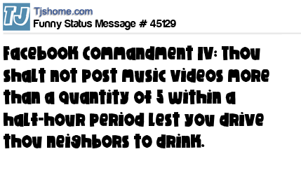 X says Facebook Commandment IV: Thou shalt not post music videos more than a quantity of 5 within a half-hour period lest you drive thou neighbors to drink.