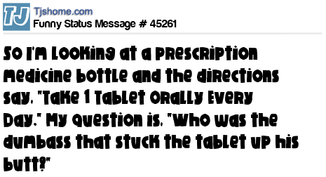 X So I'm looking at a prescription medicine bottle and the directions say, "Take 1 Tablet Orally Every Day." My question is, "Who was the dumbass that stuck the tablet up his butt?"