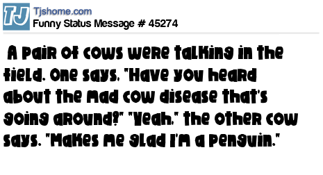 - # 19310 A pair of cows were talking in the field. One says, "Have you heard about the mad cow disease that's going around?" "Yeah," the other cow says. "Makes me glad I'm a penguin."
