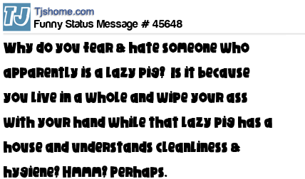 X is why do you fear & hate someone who apparently is a lazy pig? Is it because you live in a whole and wipe your ass with your hand while that lazy pig has a house and understands cleanliness & hygiene? Hmmm? Perhaps.