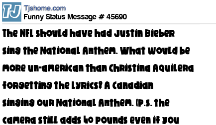 X The NFL should have had Justin Bieber sing the National Anthem. What would be more un-american than Christina Aquilera forgetting the lyrics? A Canadian singing our National Anthem. (p.s. the camera still adds 40 pounds even if you are wearing black)