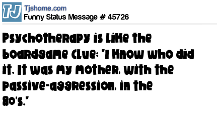 X Psychotherapy is like the boardgame Clue: "I know who did it. It was my mother, with the passive-aggression, in the 80's."