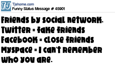 X is Friends by social network. Twitter = fake friends Facebook = close friends Myspace = I can't remember who you are.