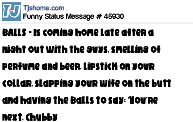 - # 45897 BALLS - Is coming home late after a night out with the guys, smelling of perfume and beer, lipstick on your collar, slapping your wife on the butt and having the Balls to say: 'You're next, Chubby