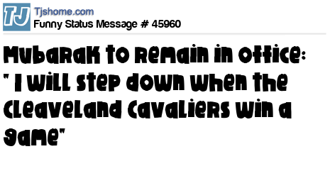 - # 46034 Apparently Mubarak was trying to wait things out: " I will step down when the Cleveland Cavaliers win a game". I think he just realized he doesn't have all year to wait...