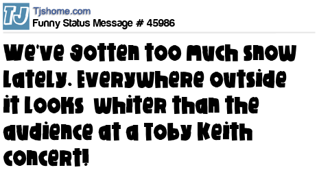 X is We've gotten too much snow lately. Everywhere outside it looks whiter than the audience at a Toby Keith concert!