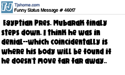 X Egyptian Pres. Mubarak finaly steps down. I think he was in denial--which coincidentally is where his body will be found if he doesn't move far far away..