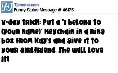 X V-day trick: Put a "I belong to (your name)" keychain in a ring box from Kay's and give it to your girlfriend. She will love it!