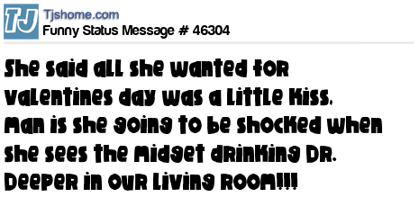 X is She said all she wanted for valentines day was a little kiss, man is she going to be shocked when she sees the midget drinking Dr. Deeper in our living room!!!