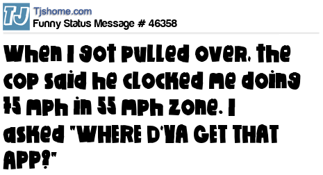 X says when I got pulled over, the cop said he clocked me doing 75 mph in 55 mph zone. I asked "WHERE D'YA GET THAT APP?"