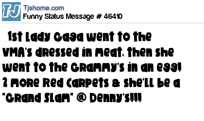 - # 46546 Lady Gaga went to the VMA's dressed as meat, now she went to the Grammy's in a egg. Two more red carpets and she will be a Denny's Grand Slam