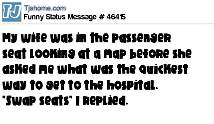 X My wife was in the passenger seat looking at a map before she asked me what was the quickest way to get to the hospital. "Swap seats" I replied.