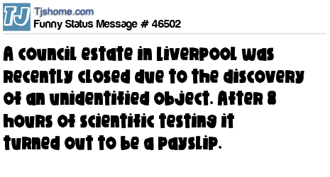 X A council estate in Liverpool was recently closed due to the discovery of an unidentified object. After 8 hours of scientific testing it turned out to be a payslip.