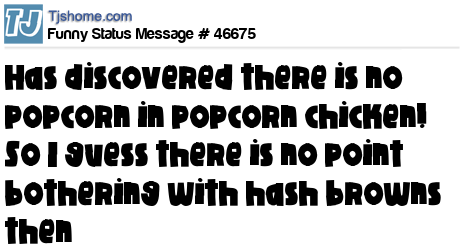 - # 7632 just found out there is no popcorn in popcorn chicken!!!!! I guess there is no point in eating HASH browns is there?