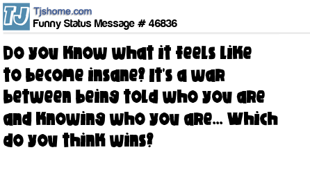 X Do you know what it feels like to become insane? It's a war between being told who you are and knowing who you are... Which do you think wins?