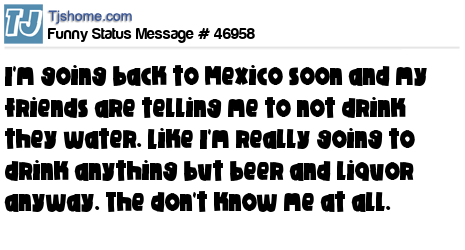 X I'm going back to Mexico soon and my friends are telling me to not drink they water. Like I'm really going to drink anything but beer and liquor anyway. The don't know me at all.