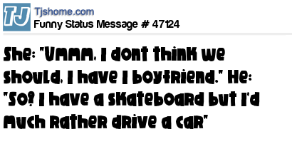 X She: "Ummm, I dont think we should, I have I boyfriend." He: "So? I have a skateboard but I'd much rather drive a car"