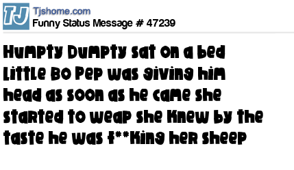 X says Humpty Dumpty sat on a bed Little Bo Pep was giving him head as soon as he came she started to weap she knew by the taste he was f**king her sheep