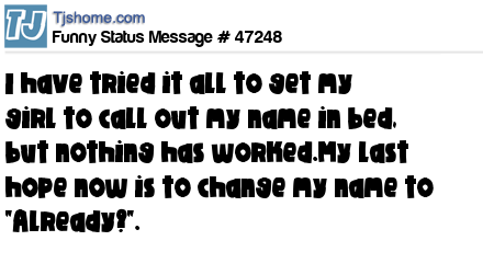 - # 39435 I have tried it all to get my girl to call out my name in bed, but nothing has worked.My last hope now is to change my name to "Already?".