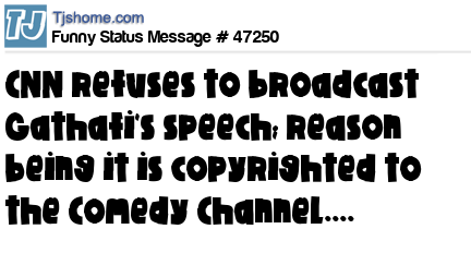 X CNN refuses to broadcast Gathafi's speech; reason being it is copyrighted to the Comedy Channel....