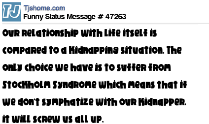 X is Our relationship with life itself is compared to a kidnapping situation. The only choice we have is to suffer from Stockholm Syndrome which means that if we don't symphatize with our kidnapper, it will screw us all up.