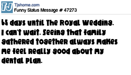 X 65 days until The Royal Wedding. I can't wait. Seeing that family gathered together always makes me feel really good about my dental plan.