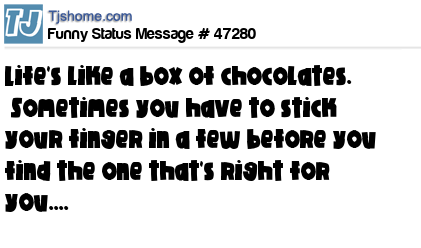 - # 123990 Life is like a box of chocolates. Sometimes you have to stick your finger in a few before you find the one that's right for you.... and try to stay away from the ones that already have teethmarks in them....