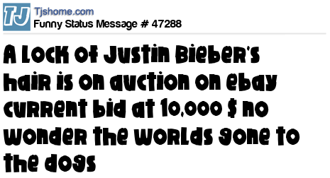 X says A lock of Justin Bieber's hair is on auction on ebay current bid at 10,000 $ no wonder the worlds gone to the dogs