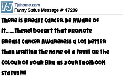 X says There is Breast Cancer, be Aware of it.......There! Doesn't that promote Breast Cancer Awareness a lot better than writing the name of a Fruit or the Colour of your Bra as your Facebook status?!?