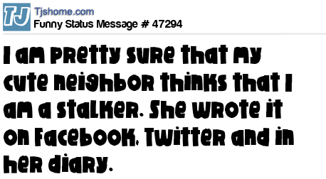 X  I am pretty sure that my cute neighbor thinks that I am a stalker. She wrote it on Facebook, Twitter and in her diary.