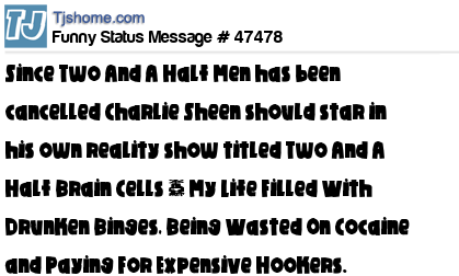 X Since Two And A Half Men has been cancelled Charlie Sheen should star in his own reality show titled Two And A Half Brain Cells ~ My Life Filled With Drunken Binges, Being Wasted On Cocaine and Paying For Expensive Hookers.