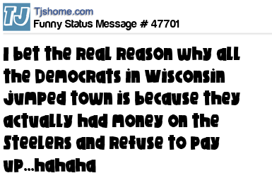 X says I bet the real reason why all the Democrats in Wisconsin jumped town is because they actually had money on the Steelers and refuse to pay up...hahaha