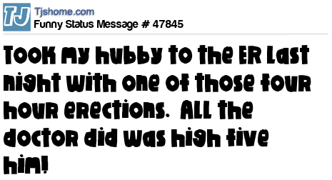 X is Took my hubby to the ER last night with one of those four hour erections. All the doctor did was high five him!