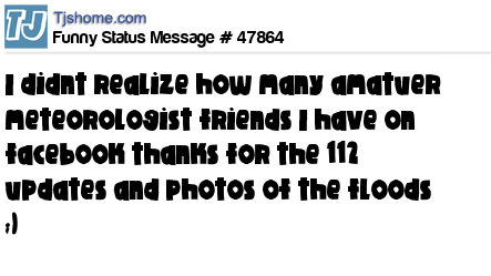X is i didnt realize how many amatuer meteorologist friends I have on facebook thanks for the 112 updates and photos of the floods ;)