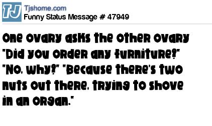 X One ovary asks the other ovary "Did you order any furniture?" "No, why?" "Because there's two nuts out there, trying to shove in an organ."