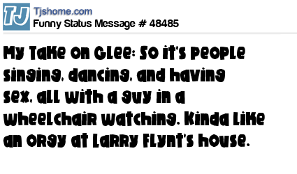 X My Take on Glee: So it's people singing, dancing, and having sex, all with a guy in a wheelchair watching. Kinda like an orgy at Larry Flynt's house.