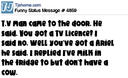 X says T.V man came to the door. He said. You got a TV licence? I said no. Well you've got a Ariel he said. I replied I've milk in the fridge to but don't have a cow.