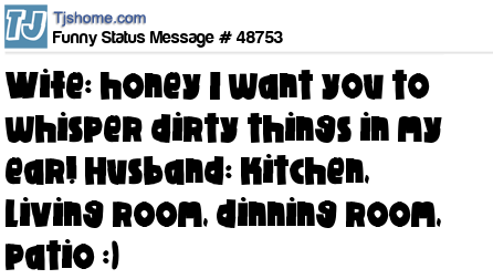 - # 48766 Wife: honey I want you to whisper dirty things in my ear! Husband: kitchen, living room, dinning room, patio...now go clean them and make me a sandwich on your way back...