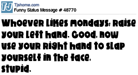 X Whoever likes mondays; raise your left hand. Good, now use your right hand to slap yourself in the face, stupid.