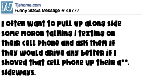 X says I often want to pull up along side some moron talking / texting on their cell phone and ask them if they would drive any better if I shoved that cell phone up their a**, sideways.